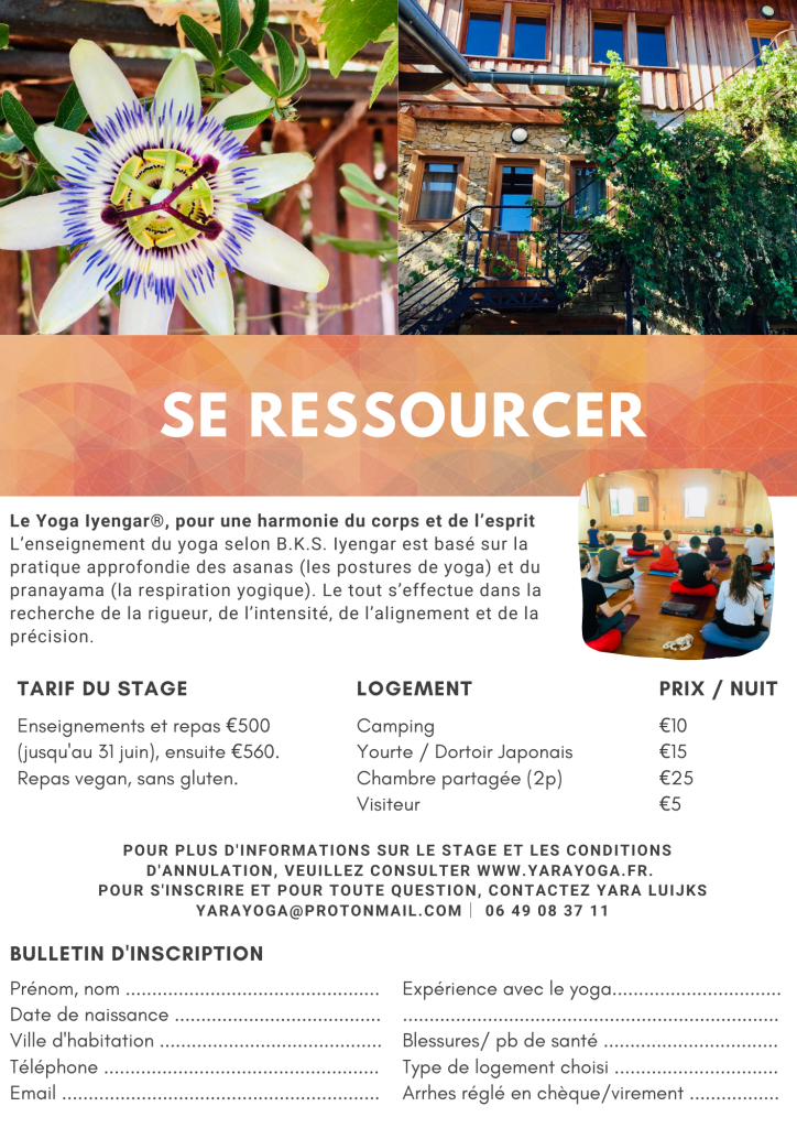 Ce stage sera un temps de détente, pour se ressourcer, étirer et renforcer son corps et se reconnecter à sa nature intérieure. Certain(e)s découvriront le yoga Iyengar au cours de ce stage, d’autres pourront approfondir leur pratique. L’enseignement est progressif et adapté à chacun, notamment grâce à l’usage du matériel (sangles, briques, chaises) afin que chacun puisse bénéficier des postures de yoga: le but étant de se faire du bien.