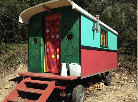 Roulotte: Une roulotte d’inspiration tzigane, fabriquée localement. Elle est équipée d’un lit en 120. Des toilettes sèches et des douches sont à proximité.
