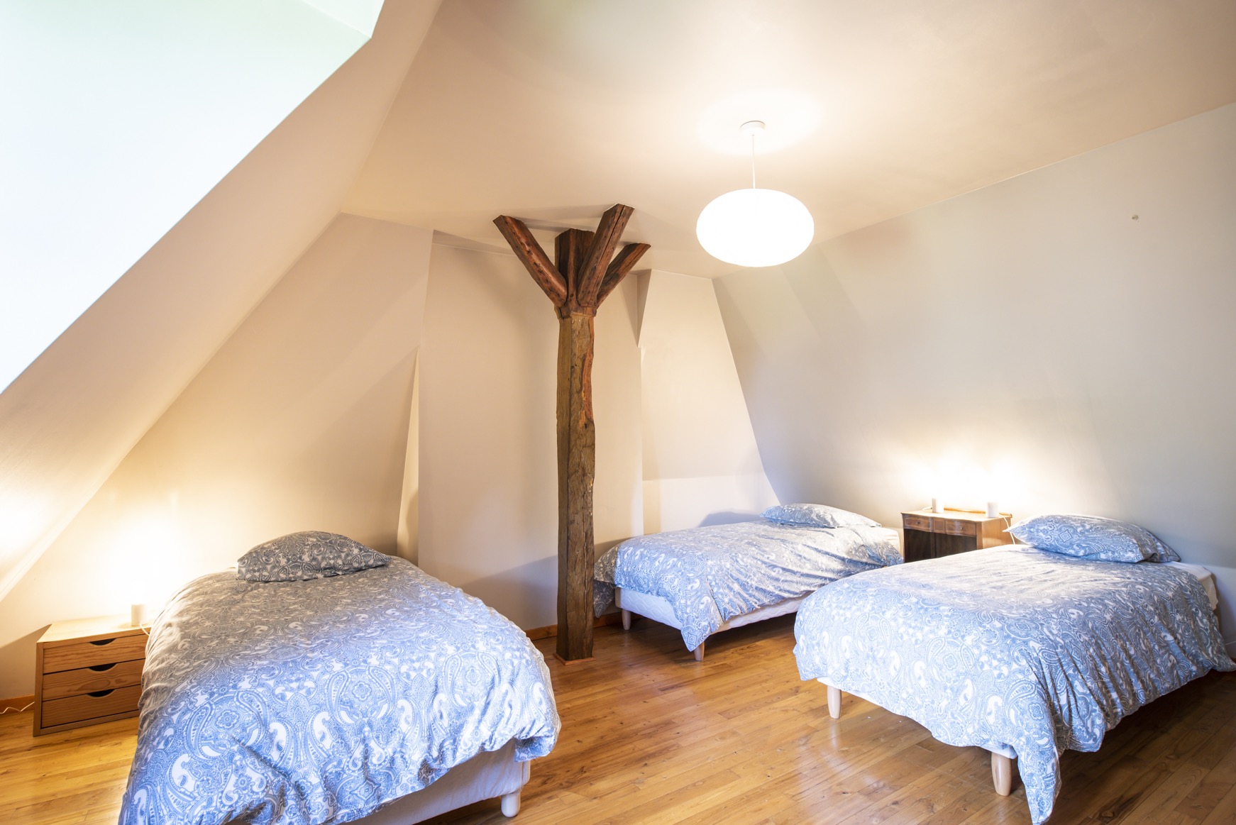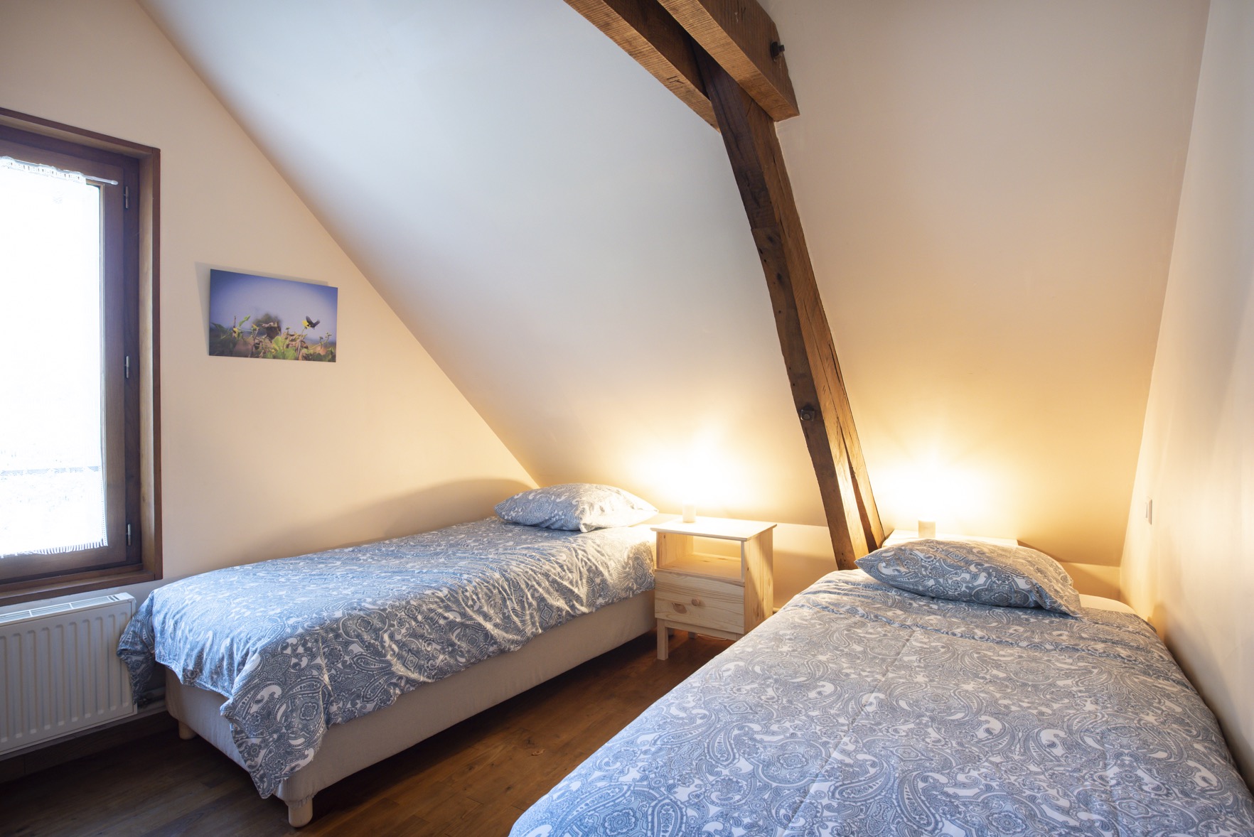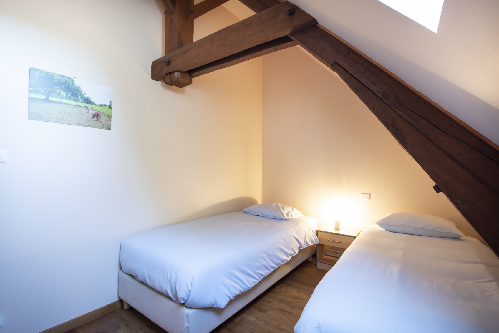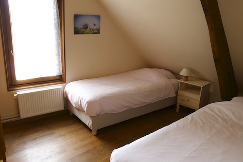 L’hébergement se fait dans les chambres de l’un des deux gîtes à l’Oasis de l’Aube : le Gîte Tulsi et le Gîte Padme. Les chambres peuvent accueillir 2 à 3 personnes. Dans l’un des gîtes, chaque chambre dispose de sa propre salle de bain et de toilettes. Dans l’autre gîte, il y a une salle de bain et des toilettes avec lavabo à chaque étage. Toutes les chambres sont équipées de fenêtres, de rangements et de lampes de chevet.