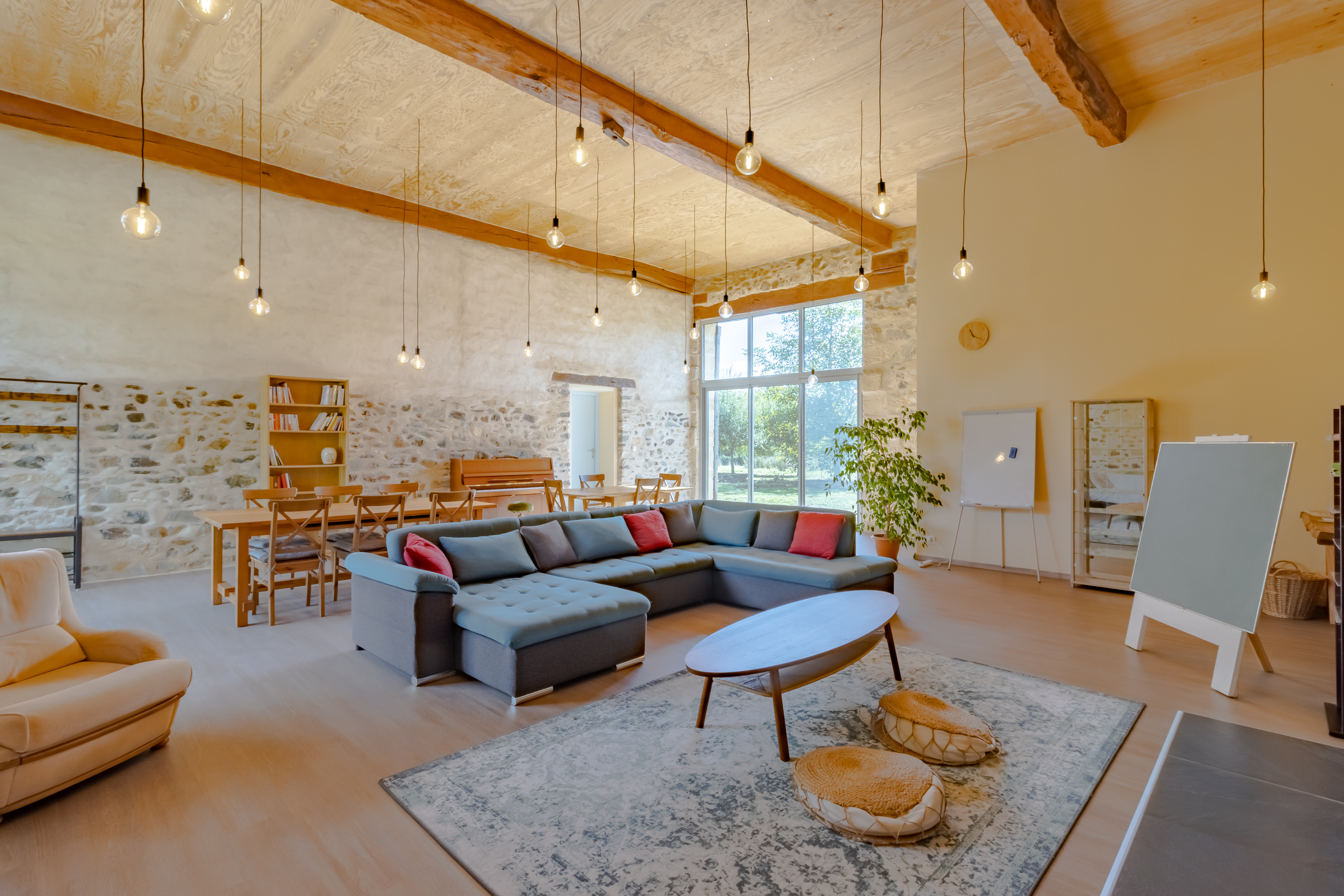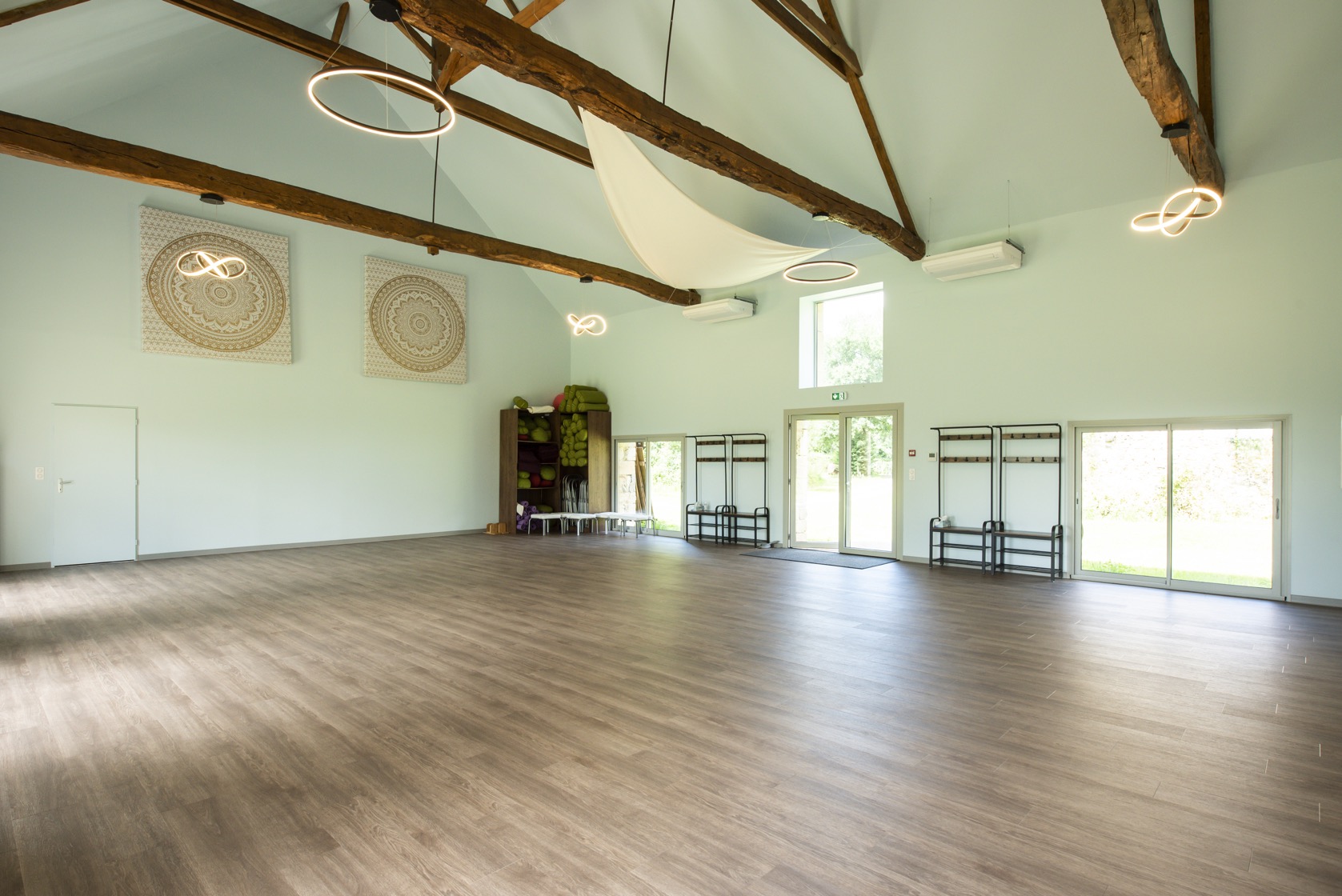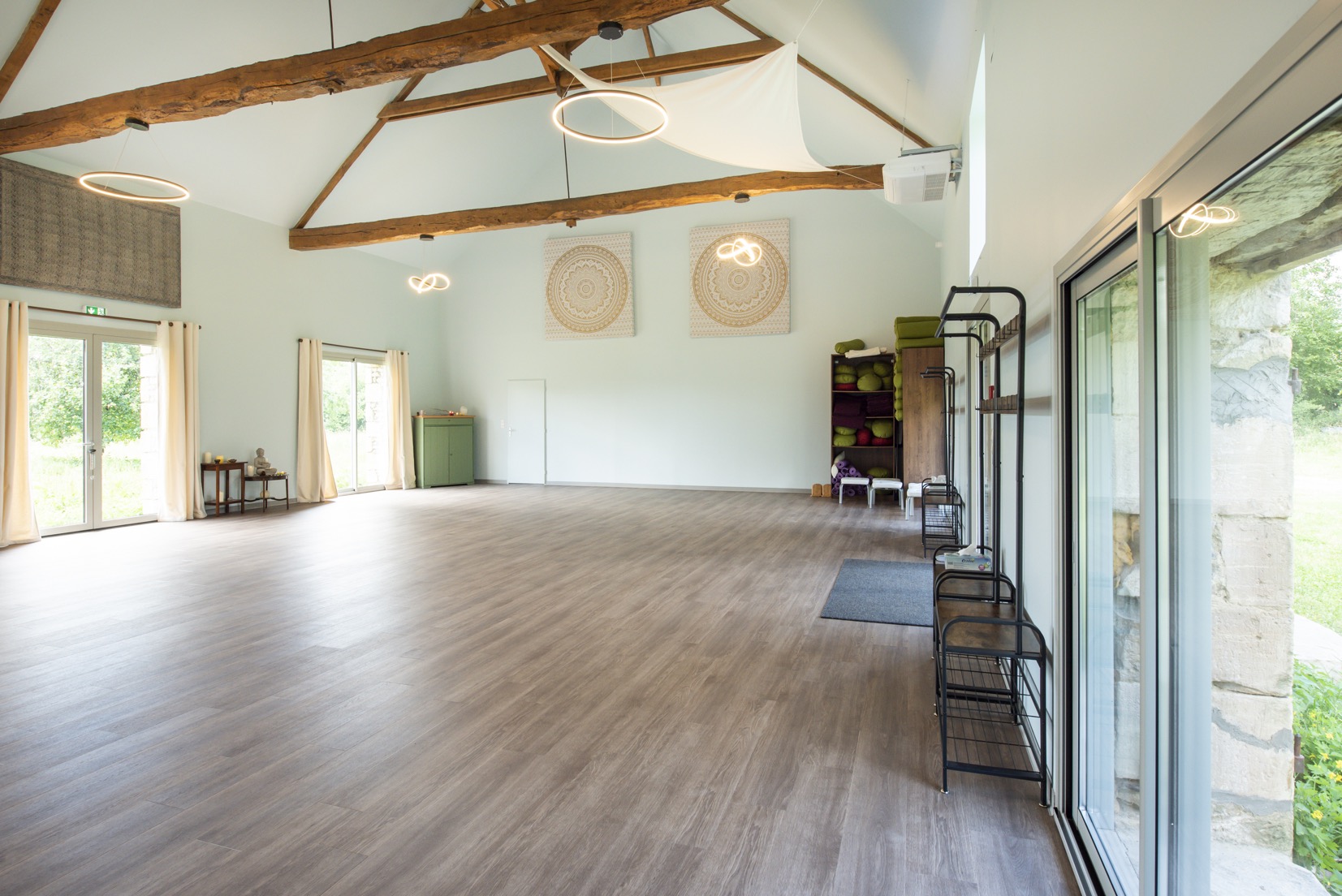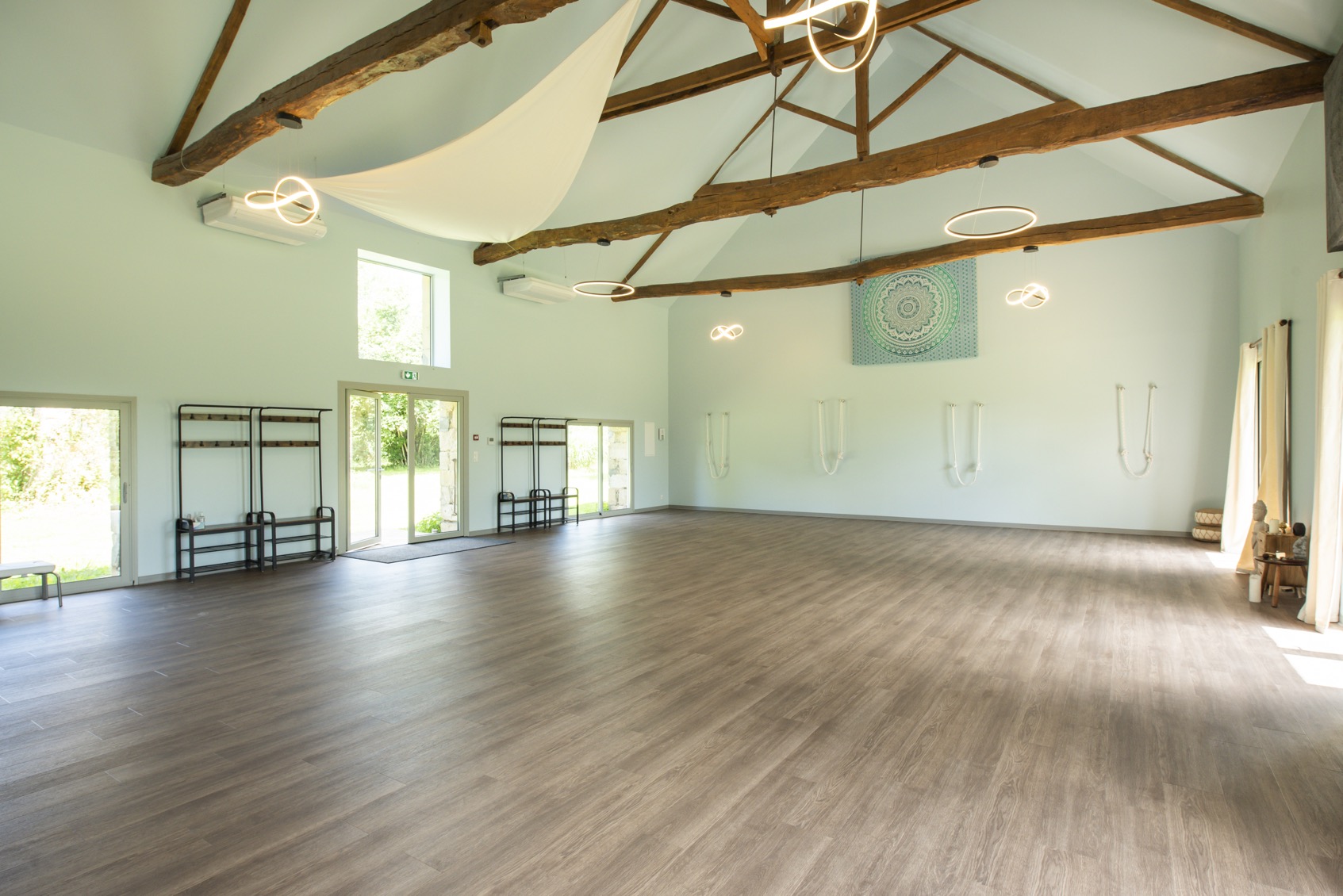La salle de yoga fait 126 m2 avec vue sur la nature et tout le matériel nécessaire au yoga et à la méditation. Vous y trouverez des sangles, différentes tailles de briques, coussins de méditation, bolsters de différentes tailles, chaises de yoga et évidemment des tapis. Il y a également des cordes aux murs et des feet-up pour vous entrainer aux équilibres. Tout le matériel est de qualité biologique.