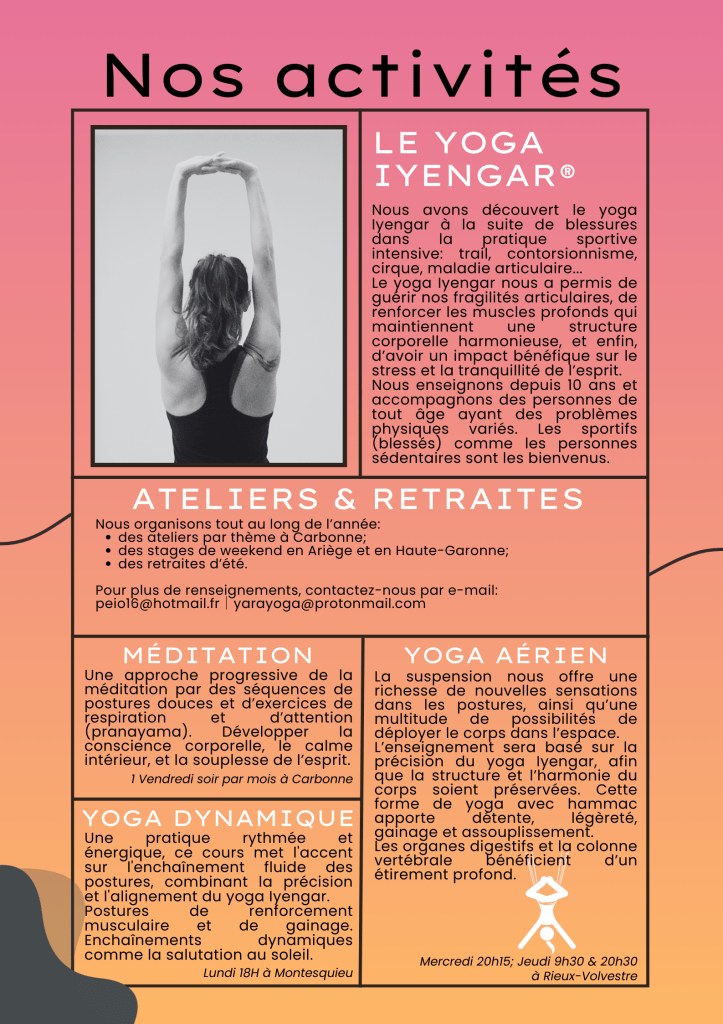 | 9h30 Yoga Iyengar Saint Girons Yara | 9h30 Yoga Aérien Rieux Volvestre Yara | 10h00 Yoga Iyengar Carbonne Peio | ||